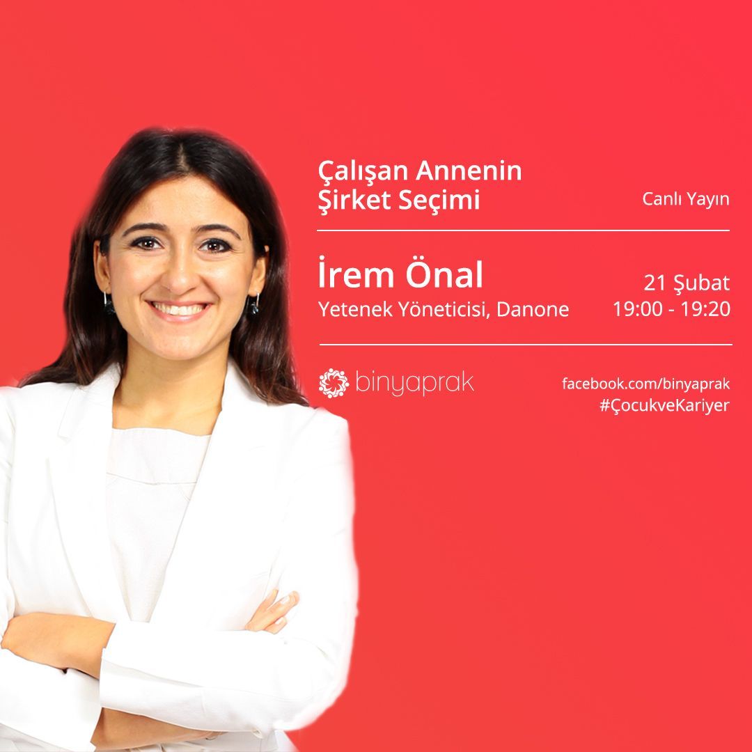 Danone Yetenek Yöneticisi İrem Önal, 21 Şubat saat 19.00'da Çalışan Annenin Şirket Seçimi canlı yayını ile BinYaprak Facebook sayfasında olacak! Sen de online ol, sorularını sor, sohbet